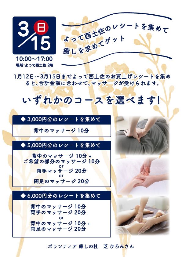 1月12日~3月15日までの間、よって西土佐のお買い上げレシートを集めると合計金額に応じたマッサージが受けられます!
