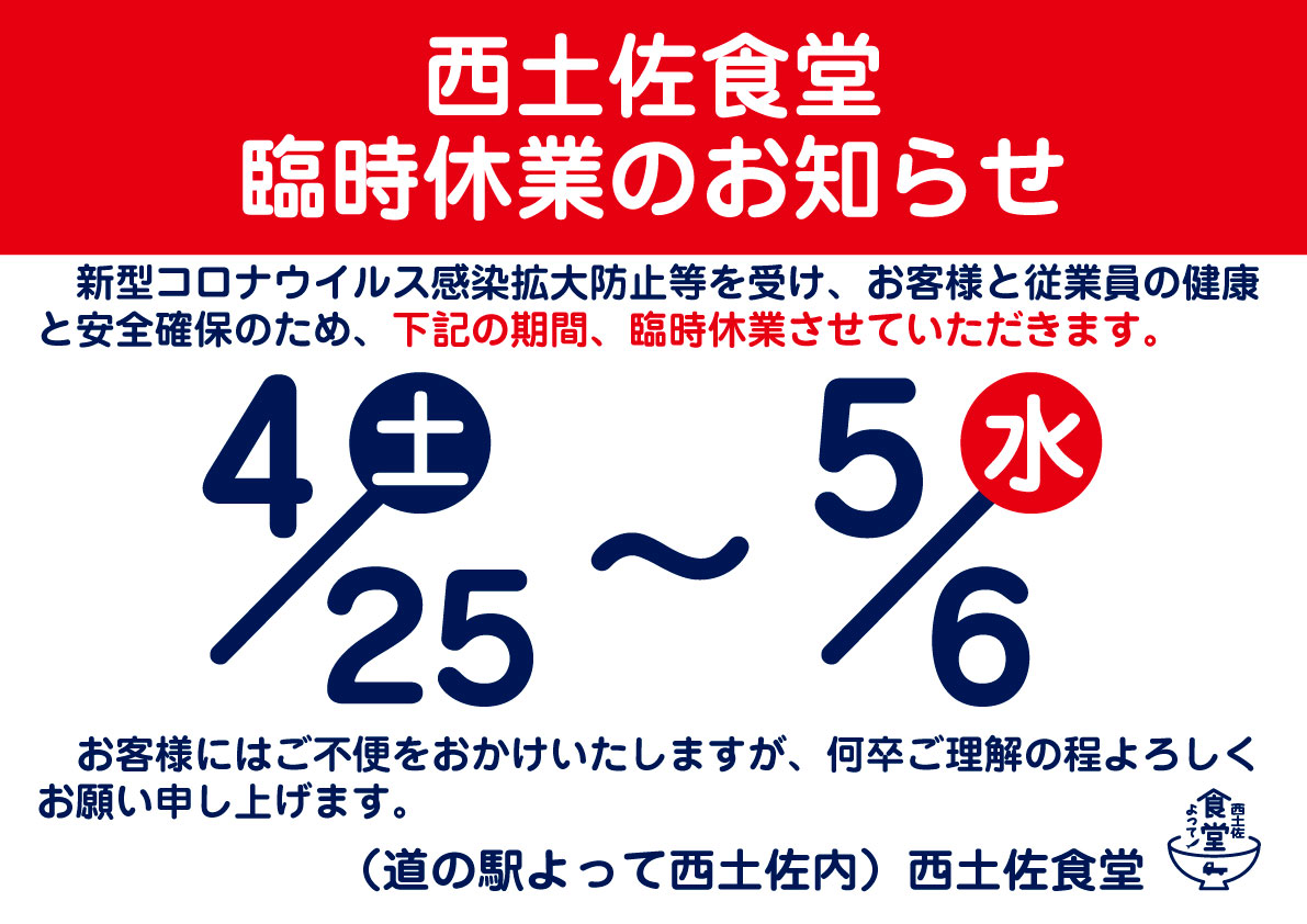 【西土佐食堂】4/25~5/6まで 臨時休業のお知らせ