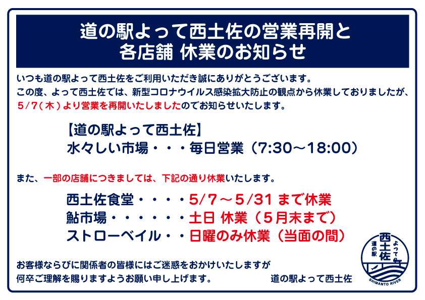 この度、よって西土佐では、新型コロナウイルス感染拡大防止の観点から臨時休業しておりましたが、5/7(木)より営業を再開いたしましたのでお知らせいたします。