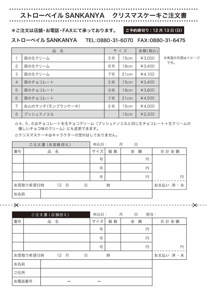 ご予約はストローベイルSANKANYAの店頭またはお電話、FAXにて承っております。
