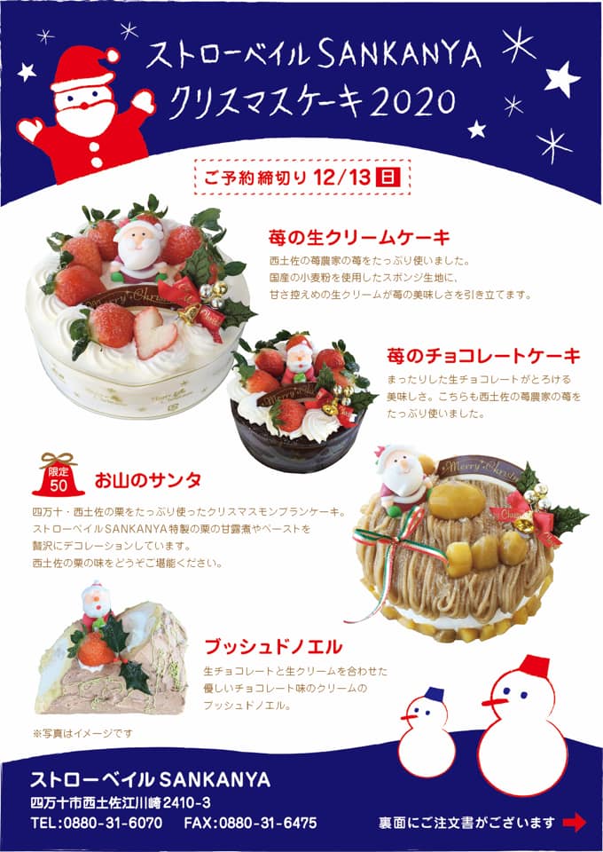 西土佐の苺を使ったクリスマスケーキをはじめ、人気のモンブランのクリスマスケーキなど…詳しくはチラシをご覧ください。