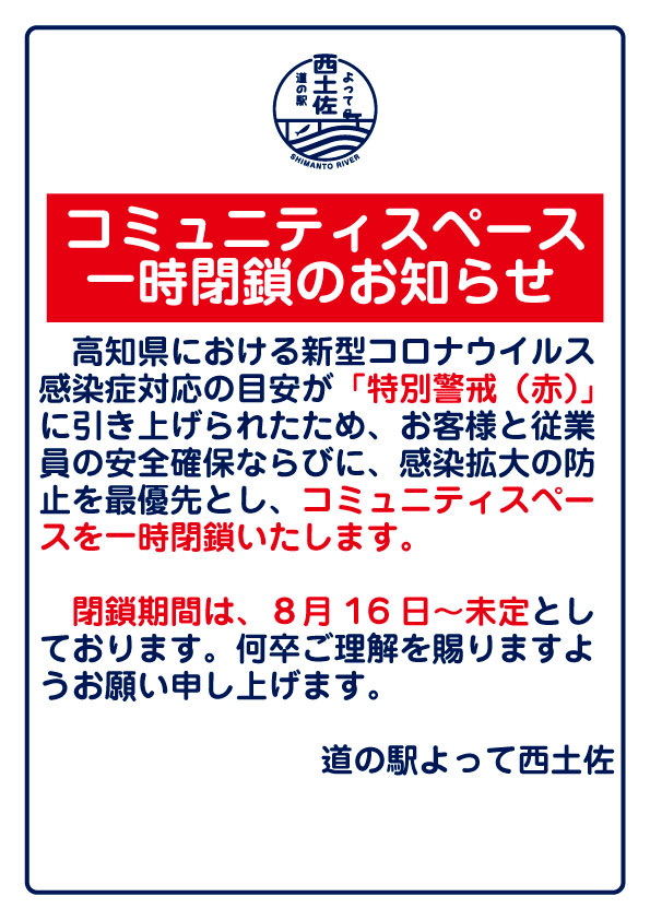 高知県における新型コロナウイルス感染症対策の目安が「特別警戒(赤)」に引き上げられたため、お客様と従業員の安全確保ならびに、感染拡大の防止を最優先とし、コニュニティスペースを一時閉鎖いたします。