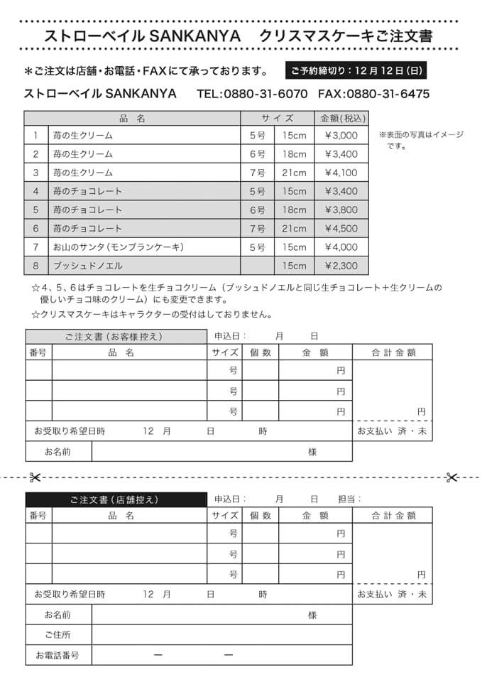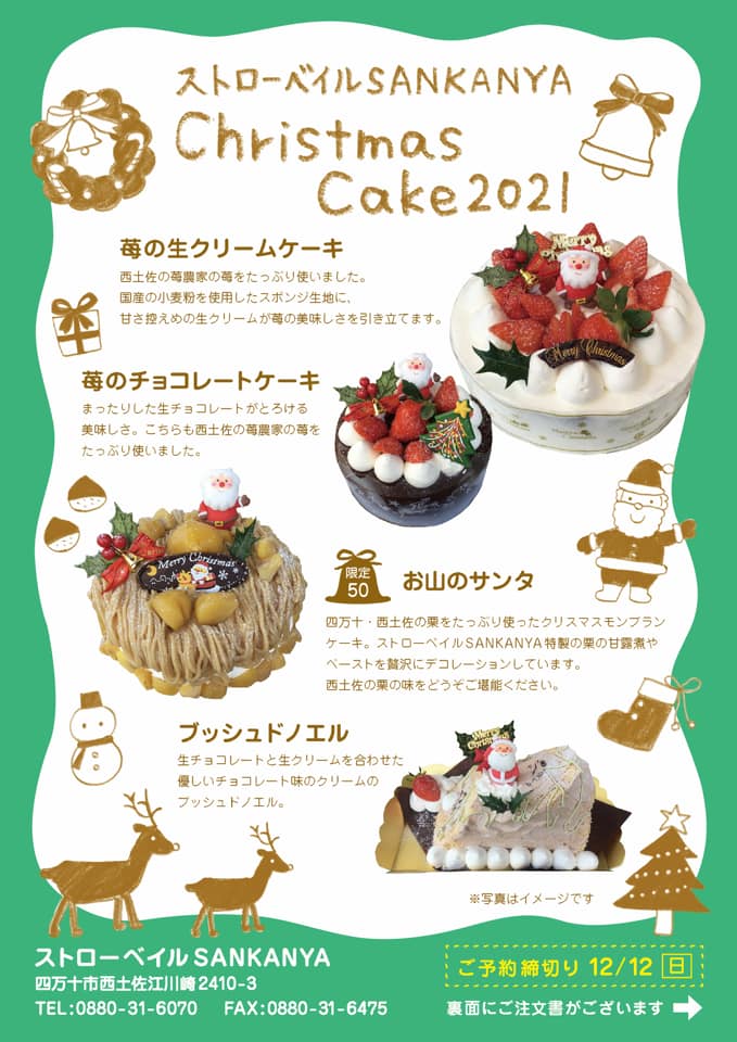 道の駅よって西土佐内のケーキカフェ「ストローベイルSANKANYA」では、今年もクリスマスケーキの予約受付を始めました!