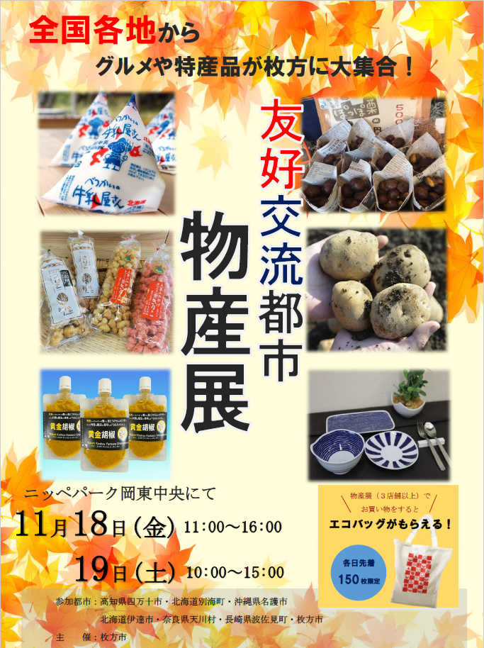 11月18~19日 大阪府枚方市で開催される【友好交流都市物産展】に出店いたします!