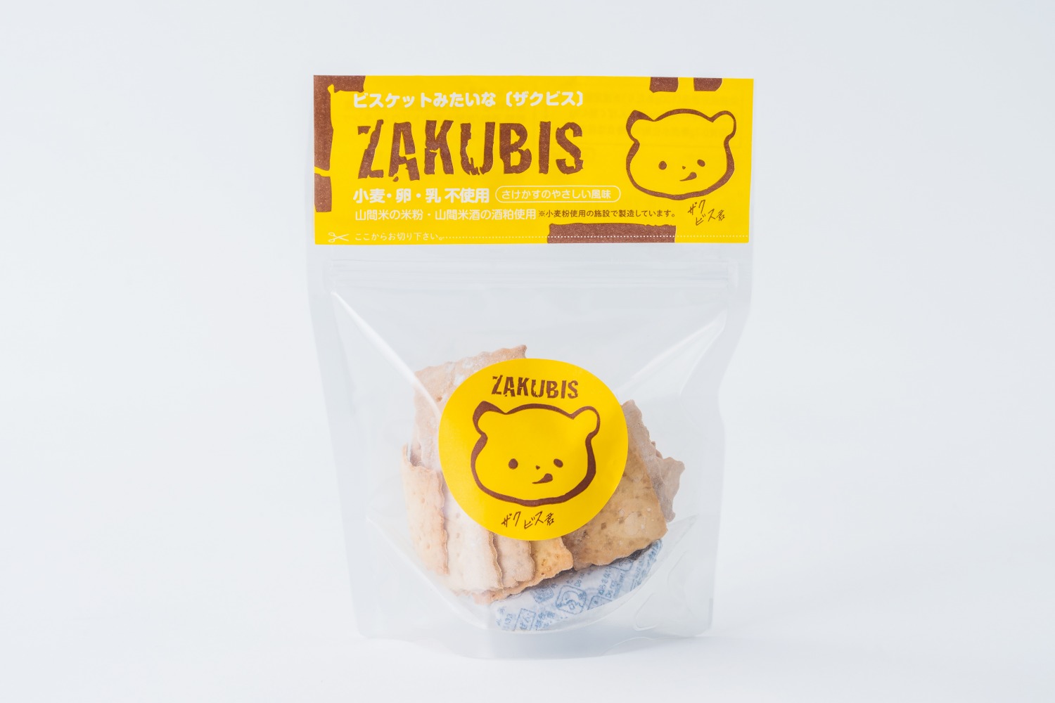 ザクビスは、山間米の米粉と、山間米からできたお酒の酒粕を使ったオール山間米の焼き菓子です。乳・小麦・卵を使っていないグルテンフリー。酒粕の風味でクセになります!