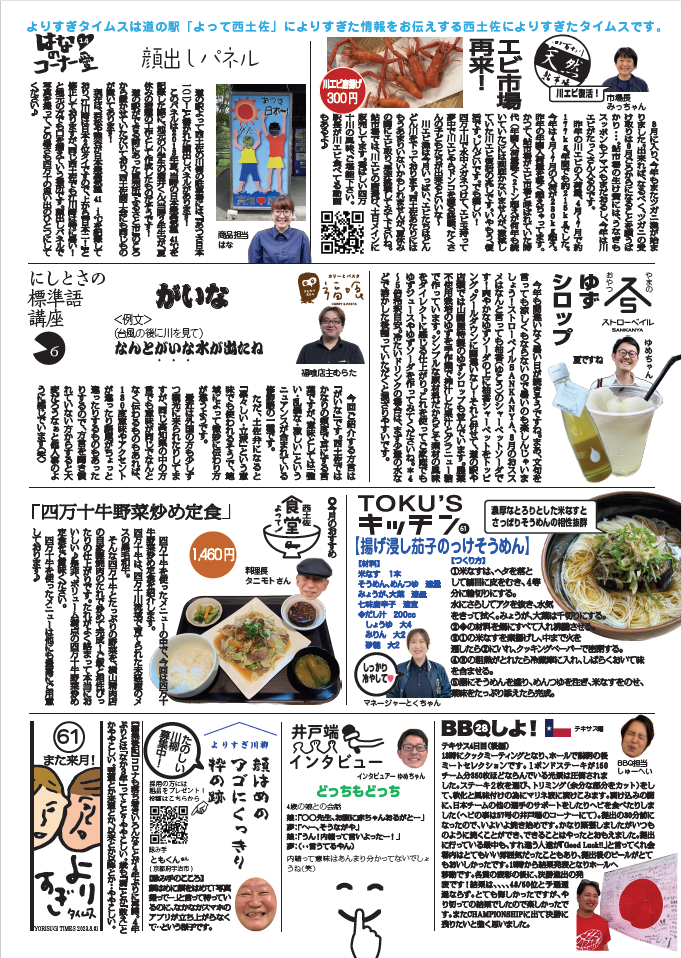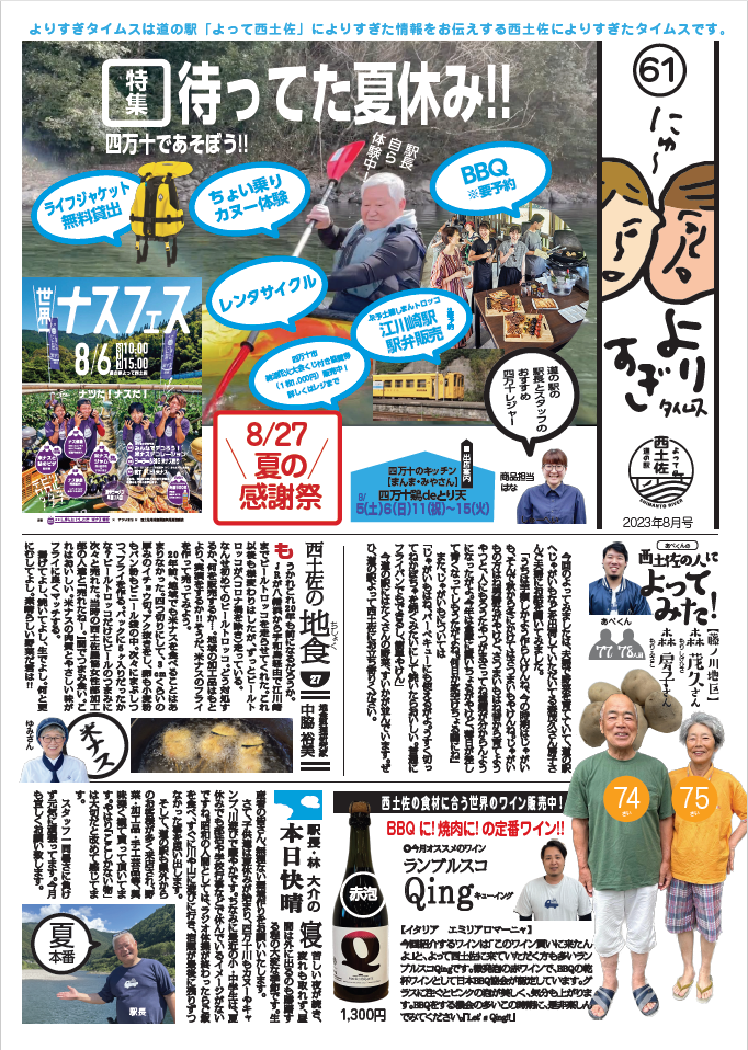 日々のこと 2023.08.01 よりすぎタイムス8月号ができました! 道の駅よって西土佐の情報誌よりすぎタイムスの8月号ができました!ぜひ読んでみてください♪ ▼高画質版はこちらから 一覧に戻る 最近の記事 2026.04.18 【4/25(土)~11/30(月)『帰ってきた!カレー街道!奥伊予・四万十街道グルメデジタルスタンプラリー』開催!】 2026.04.02 よりすぎタイムス4月号ができました! 2026.03.31 2026/4/5(日)【道の駅よって西土佐】『10周年だよ!よっておきゃく!』臨時駐車場のご案内 2026.03.17 2026/4/5(日)【10周年だよ!よっておきゃく!】開催!