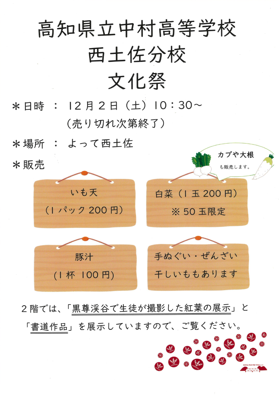 西土佐分校の生徒さんが、自分たちで育てた白菜の販売や、栽培したさつまいもを使った芋てんの販売、数量限定で豚汁の販売などを行います!