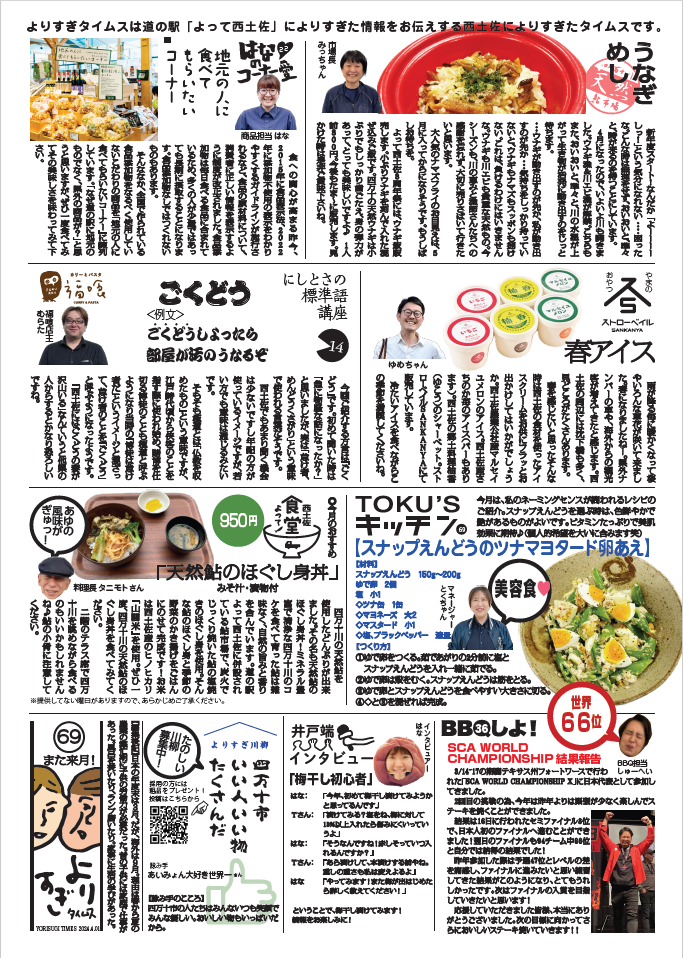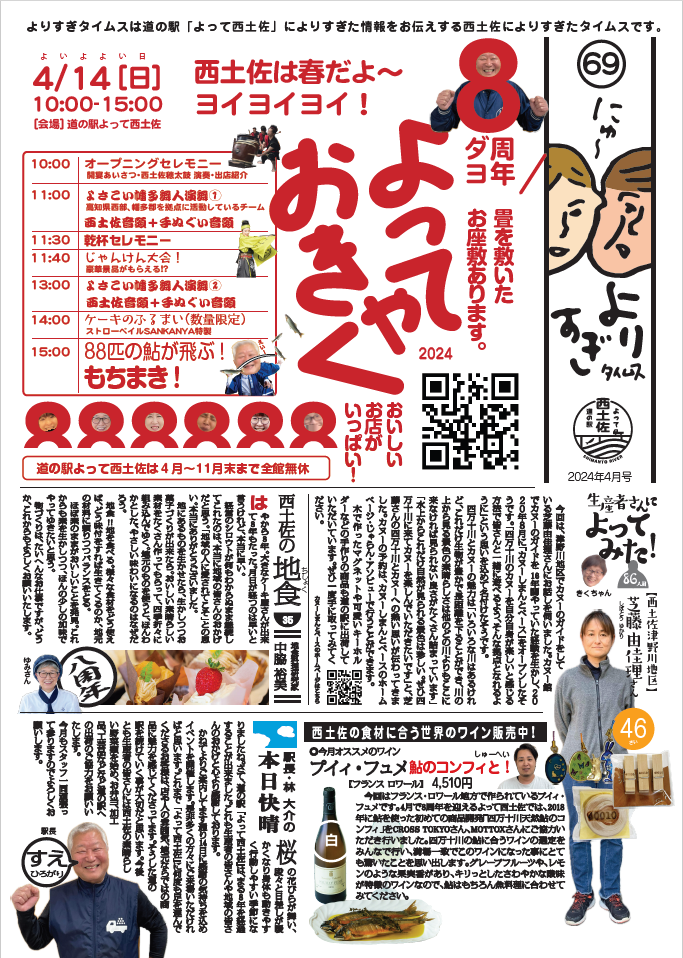 日々のこと 2024.04.02 よりすぎタイムス4月号ができました! 道の駅よって西土佐の情報誌よりすぎタイムス4月号ができました! ぜひご一読ください! ▼PDFはこちらから ▼バックナンバーはこちら 一覧に戻る 最近の記事 2026.04.18 【4/25(土)~11/30(月)『帰ってきた!カレー街道!奥伊予・四万十街道グルメデジタルスタンプラリー』開催!】 2026.04.02 よりすぎタイムス4月号ができました! 2026.03.31 2026/4/5(日)【道の駅よって西土佐】『10周年だよ!よっておきゃく!』臨時駐車場のご案内 2026.03.17 2026/4/5(日)【10周年だよ!よっておきゃく!】開催!