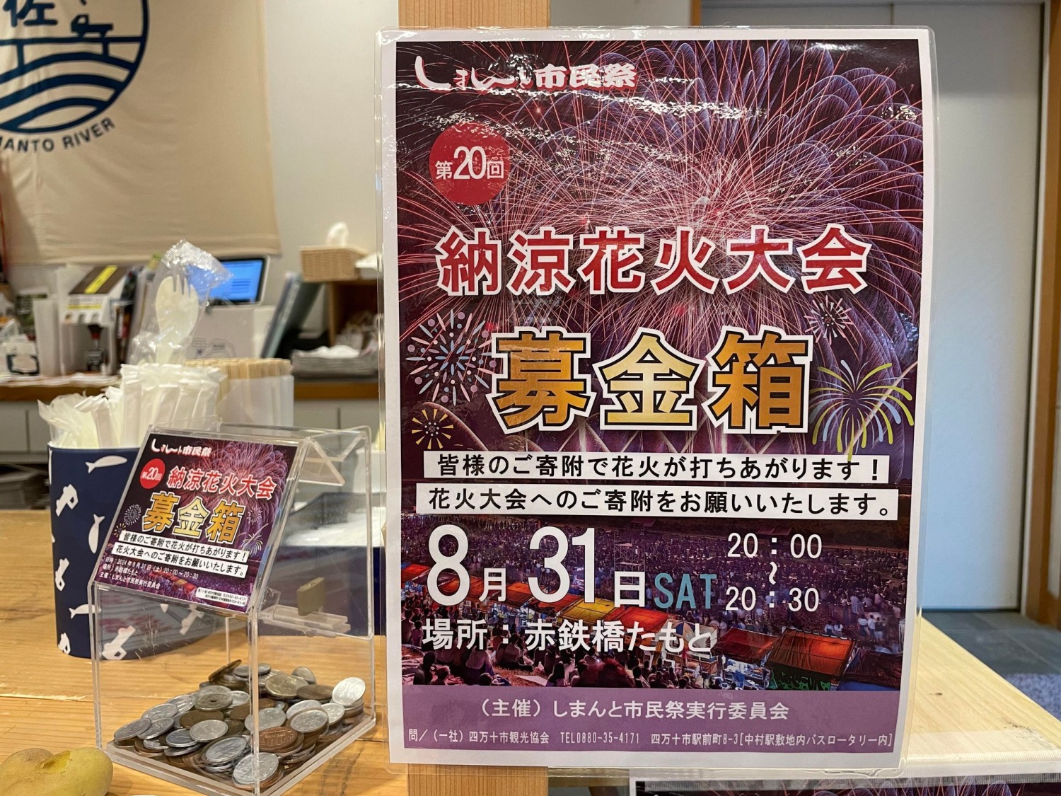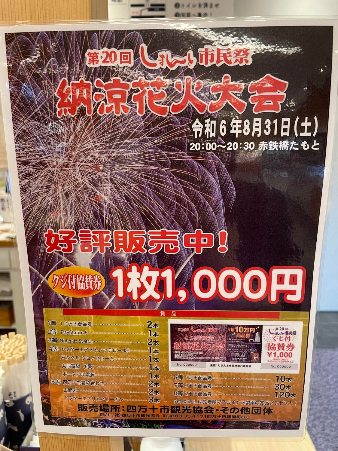 令和6年8月31日に四万十市で行われる、「第20回しまんと市民祭 納涼花火大会」のクジ付き協賛券を道の駅よって西土佐のレジにて販売しています!