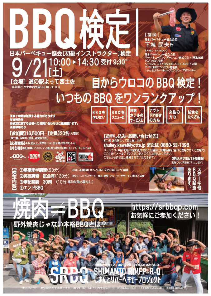 9/21(土)に、道の駅よって西土佐で、日本バーベキュー協会の『初級インストラクター検定』が開催されますよ~!