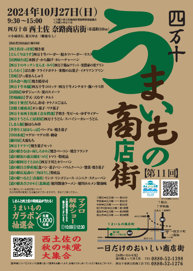 第11回四万十うまいもの商店街は、高知県四万十市西土佐江川崎の道の駅よって西土佐周辺で開催します。