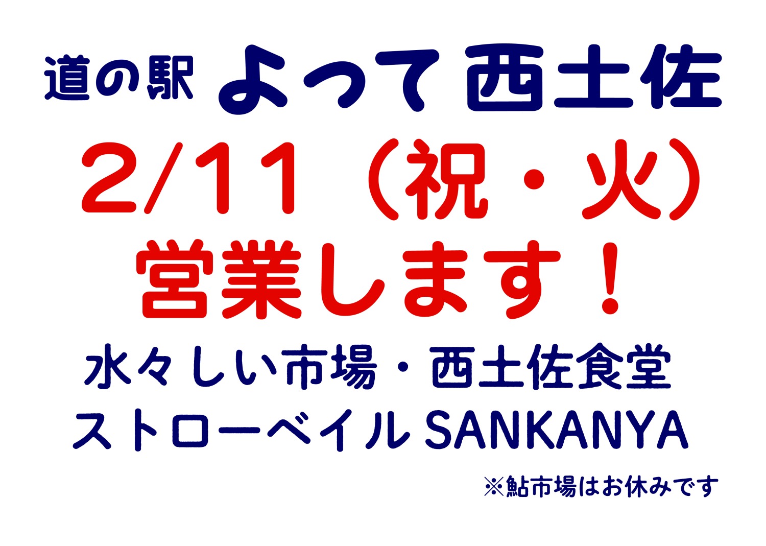 2月11日(祝・火)祝日は、直売所水々しい市場・西土佐食堂・ストローベイルSANKANYAは、営業いたします!!