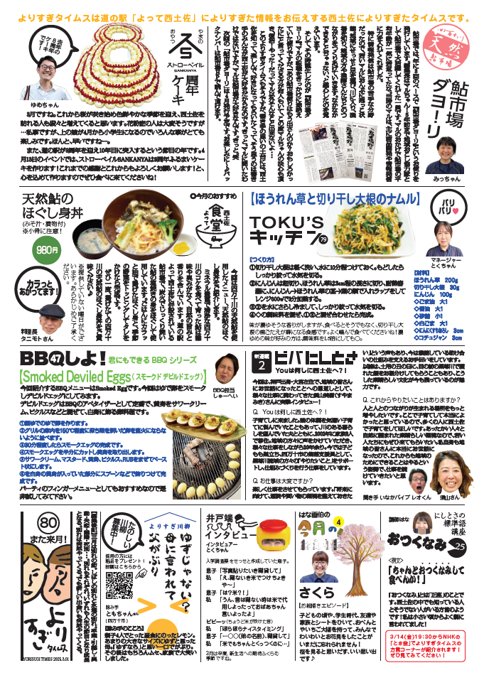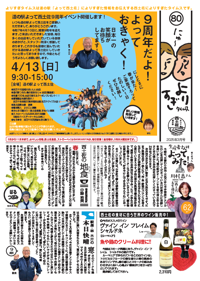 日々のこと 2025.03.01 よりすぎタイムス3月号ができました! 道の駅よって西土佐の情報誌よりすぎタイムス3月号ができました!ぜひご一読ください! ▼PDFはこちらから ▼バックナンバーはこちら 一覧に戻る 最近の記事 2026.04.18 【4/25(土)~11/30(月)『帰ってきた!カレー街道!奥伊予・四万十街道グルメデジタルスタンプラリー』開催!】 2026.04.02 よりすぎタイムス4月号ができました! 2026.03.31 2026/4/5(日)【道の駅よって西土佐】『10周年だよ!よっておきゃく!』臨時駐車場のご案内 2026.03.17 2026/4/5(日)【10周年だよ!よっておきゃく!】開催!