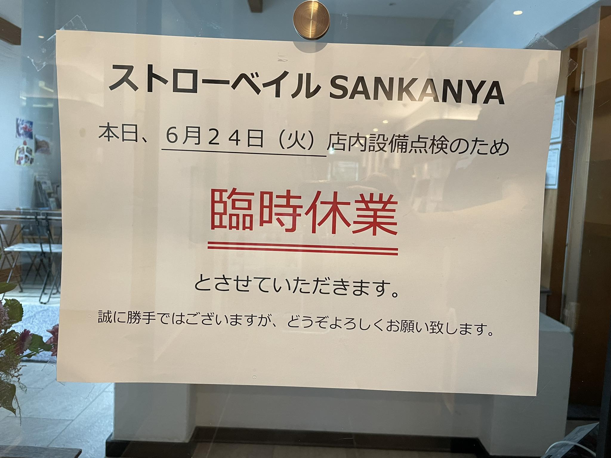 日々のこと 2025.06.24 【6/24(火)ストローベイル臨時休業のお知らせ】 本日6/24(火)、ストローベイルSANKANYAは、店内設備点検のため、臨時休業いたします。 どうぞよろしくお願いいたします。 一覧に戻る 最近の記事 2026.04.18 【4/25(土)~11/30(月)『帰ってきた!カレー街道!奥伊予・四万十街道グルメデジタルスタンプラリー』開催!】 2026.04.02 よりすぎタイムス4月号ができました! 2026.03.31 2026/4/5(日)【道の駅よって西土佐】『10周年だよ!よっておきゃく!』臨時駐車場のご案内 2026.03.17 2026/4/5(日)【10周年だよ!よっておきゃく!】開催!