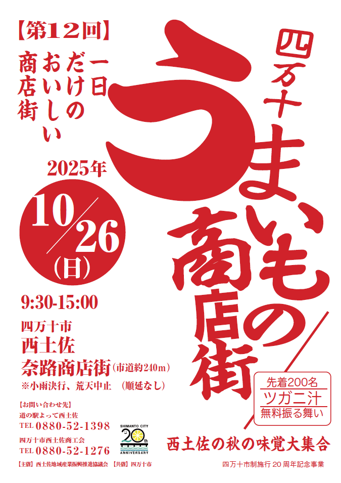 日々のこと 2025.10.01 2025/10/26(日)【第12回 四万十うまいもの商店街】開催決定! 今年も四万十うまいもの商店街が開催されますよ~♪ イベントの詳細は決まり次第、お知らせいたします! 続報をお待ちください♪ 一覧に戻る 最近の記事 2026.04.18 【4/25(土)~11/30(月)『帰ってきた!カレー街道!奥伊予・四万十街道グルメデジタルスタンプラリー』開催!】 2026.04.02 よりすぎタイムス4月号ができました! 2026.03.31 2026/4/5(日)【道の駅よって西土佐】『10周年だよ!よっておきゃく!』臨時駐車場のご案内 2026.03.17 2026/4/5(日)【10周年だよ!よっておきゃく!】開催!