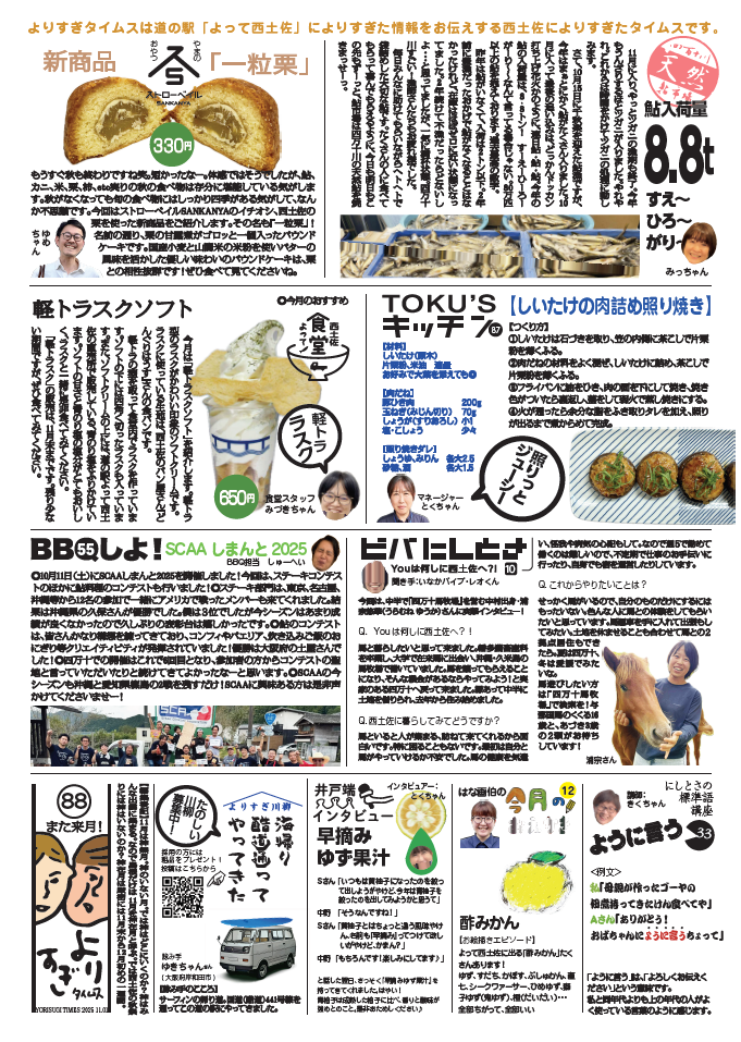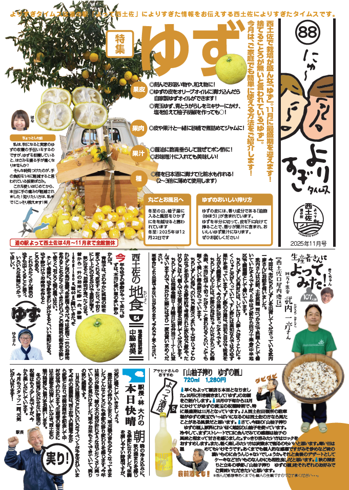日々のこと 2025.11.01 よりすぎタイムス11月号ができました! 道の駅よって西土佐の情報誌よりすぎタイムスの11月号ができました! 今月のテーマは「ゆず」です!ぜひご一読ください♪ ▼PDFはこちらから ▼バックナンバーはこちら 一覧に戻る 最近の記事 2026.04.18 【4/25(土)~11/30(月)『帰ってきた!カレー街道!奥伊予・四万十街道グルメデジタルスタンプラリー』開催!】 2026.04.02 よりすぎタイムス4月号ができました! 2026.03.31 2026/4/5(日)【道の駅よって西土佐】『10周年だよ!よっておきゃく!』臨時駐車場のご案内 2026.03.17 2026/4/5(日)【10周年だよ!よっておきゃく!】開催!