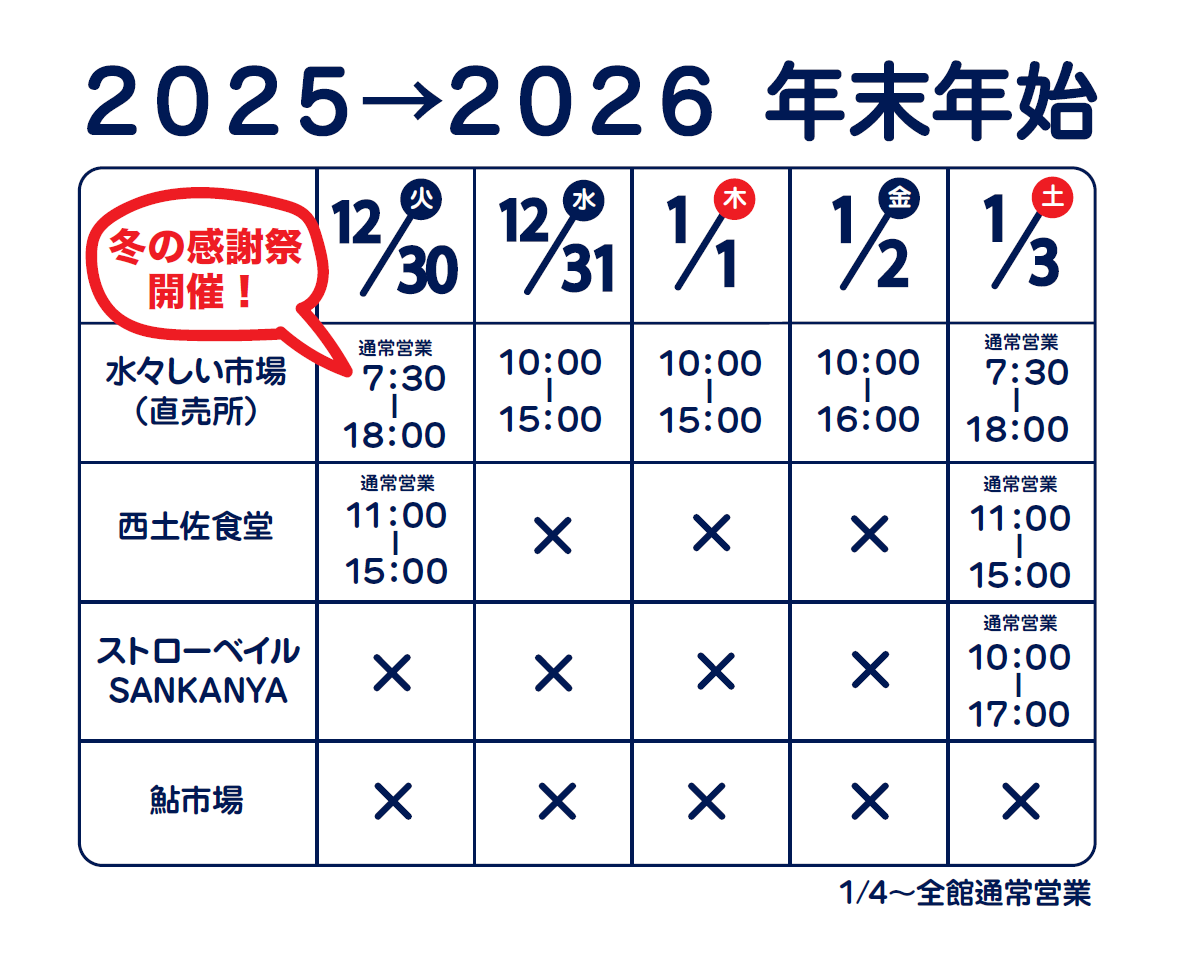 2025→2026 の年末年始は、下記の日程で営業を行う予定です。