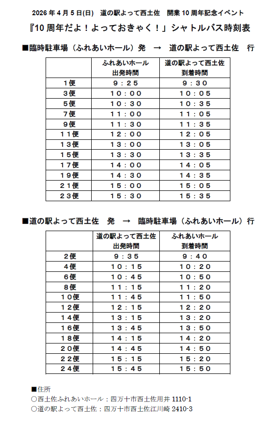 日々のこと 2026.03.13 4/5(日) 道の駅よって西土佐開業10周年記念イベント【よっておきゃく】臨時駐車場シャトルバス時刻表 10周年シャトルバス時刻表 一覧に戻る 最近の記事 2026.04.18 【4/25(土)~11/30(月)『帰ってきた!カレー街道!奥伊予・四万十街道グルメデジタルスタンプラリー』開催!】 2026.04.02 よりすぎタイムス4月号ができました! 2026.03.31 2026/4/5(日)【道の駅よって西土佐】『10周年だよ!よっておきゃく!』臨時駐車場のご案内 2026.03.17 2026/4/5(日)【10周年だよ!よっておきゃく!】開催!
