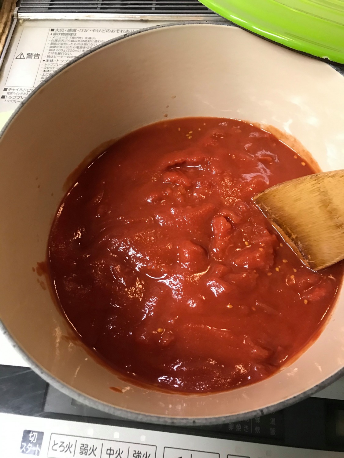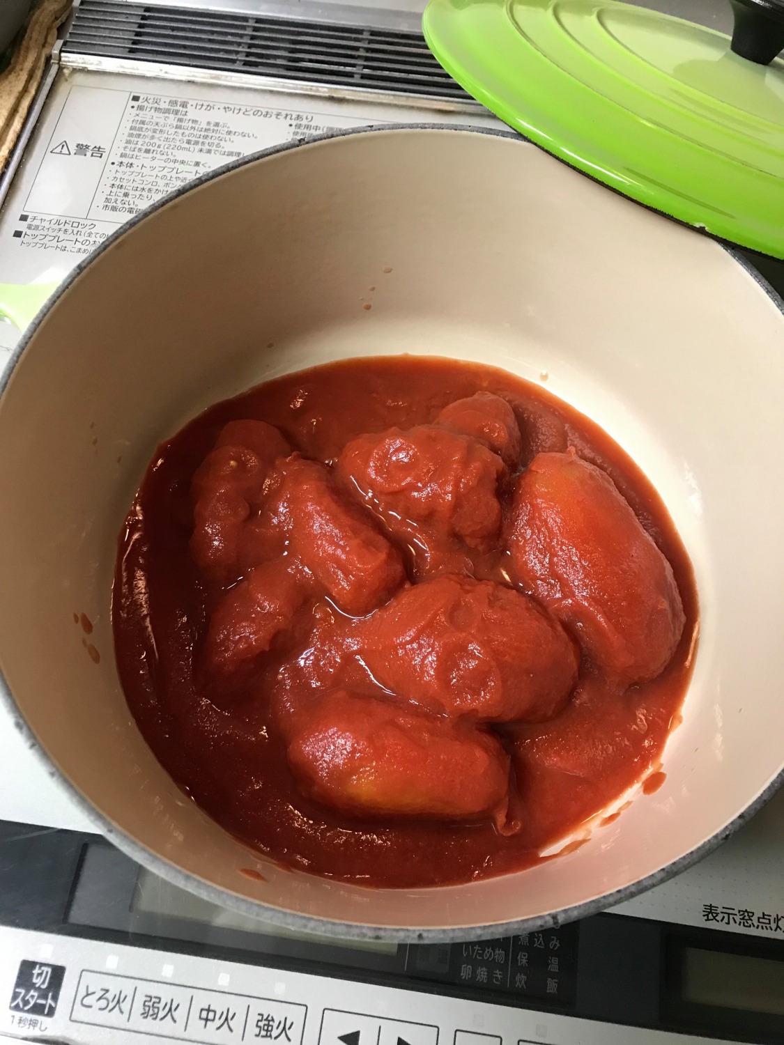 2.鍋にホールトマト缶を入れ(残った汁はもったいないので水50mlぐらいでといていれると〇)軽くつぶしておく。
