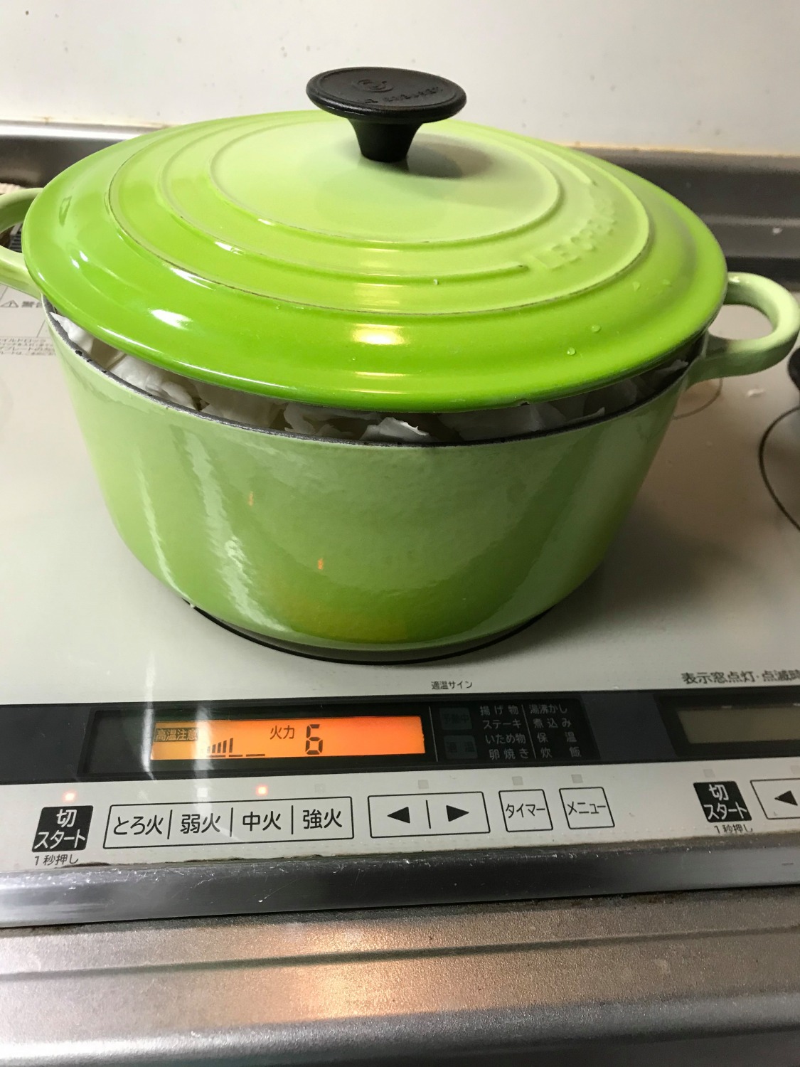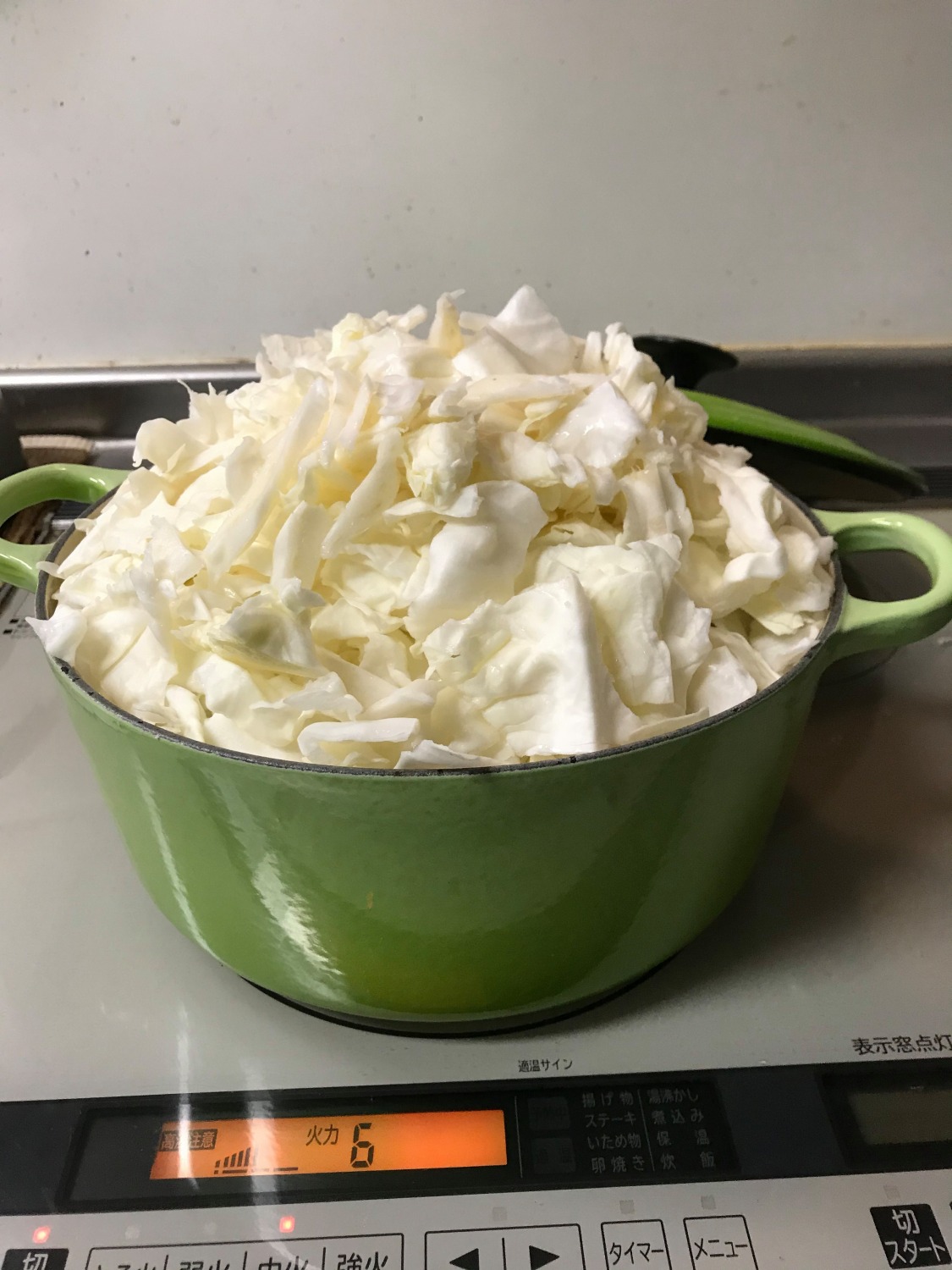 3.ふたをして、火にかける。最初は中火。10~15分位でキャベツのかさが減ってくるので一度ざっくり混ぜる。その後は弱火にして30~40分位ことこと煮込む。