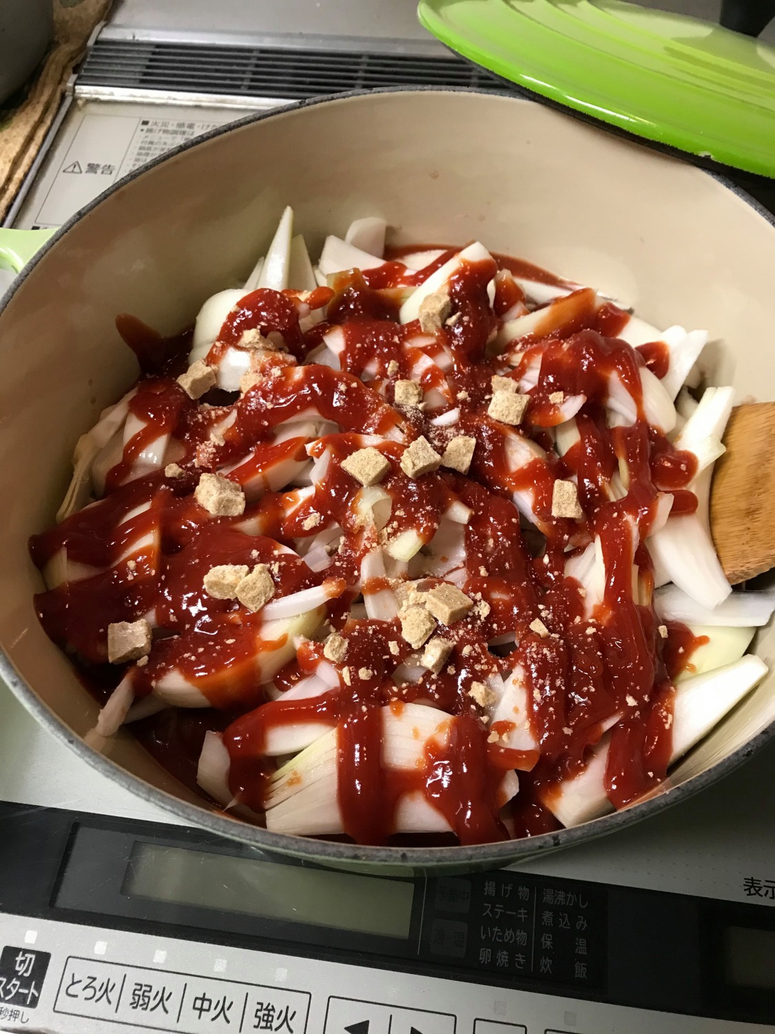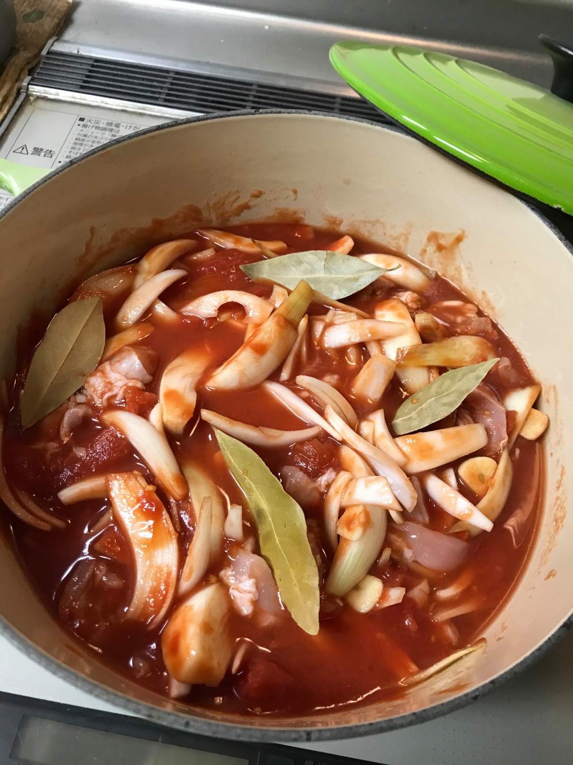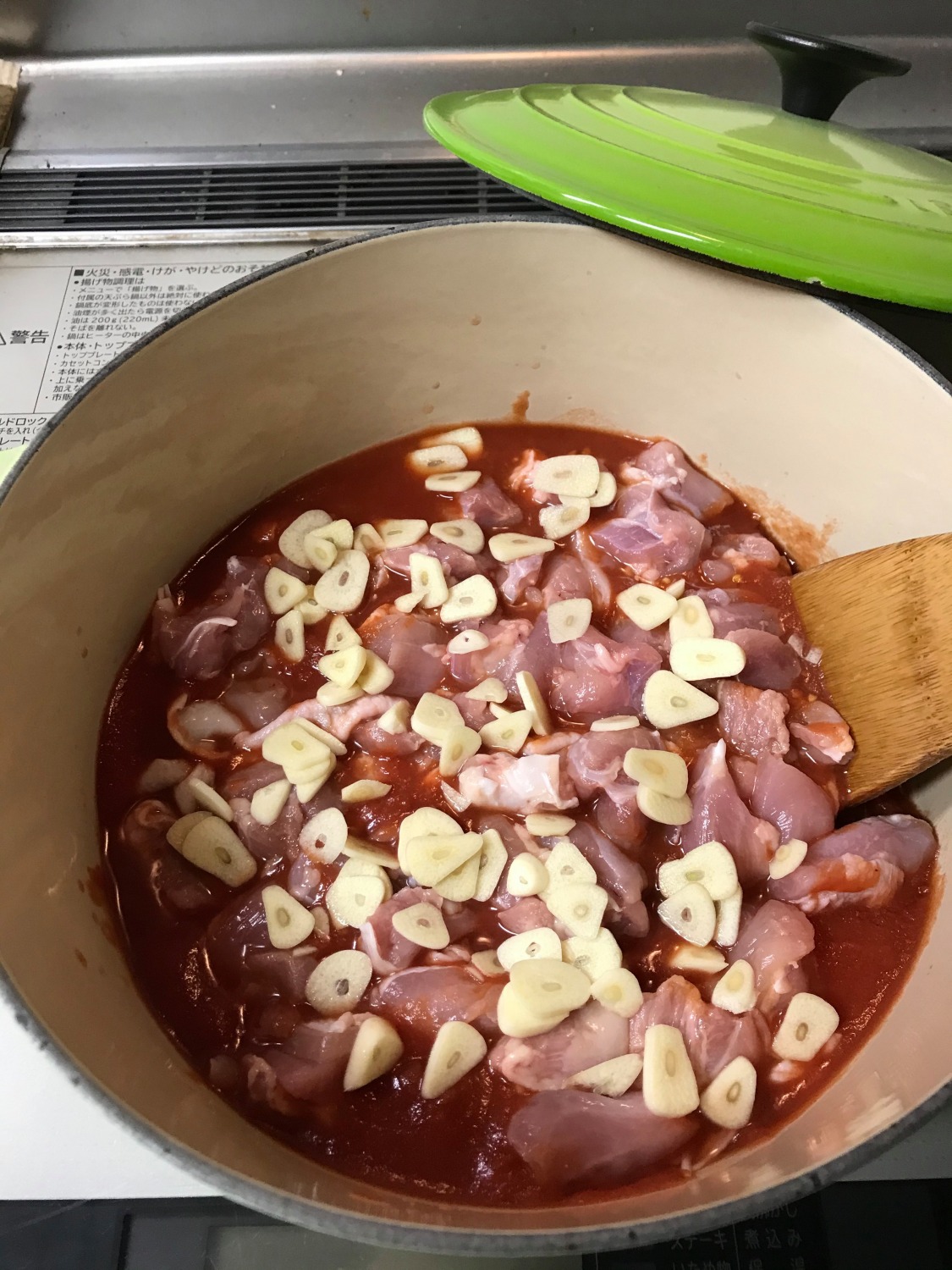 鶏肉、たまねぎ、にんにく、ローリエ、チキンコンソメ(包丁で小さく割っておくと〇)を入れて混ぜる。その上に、キャベツを全部のせる。